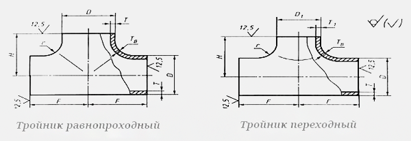 Бесшовные тройники делят на переходные (неравнопроходные) и равнопроходные по своей конструкции. У неравнопроходных тройников ответвляющая сторона всегда будет меньше основной магистрали тройника по диаметру, а у равнопроходных диаметр ответвляющей стороны и диаметры магистрали всегда одинаковые. Если заглянуть в ГОСТ 17376-01, а конкретней в пункты 4.1 и полностью 5 раздел, то можно увидеть, что там заданы чёткие требования к размерам и конструкции этих тройников. Соответствие стандарту высоты тройника, его длины и толщины стенки, которая будет присоединяться является обязательным условием при изготовлении бесшовных тройников. Существуют изготовители, которые производят тройники исходя из своих технических условий (по ТУ), обладающих геометрией, которая схожа с требованиями, описанными в стандарте ГОСТ 17376-01, однако следует обратить внимание на то, что очень часто у них высота горловины «Н» меньше требуемой в ГОСТ.